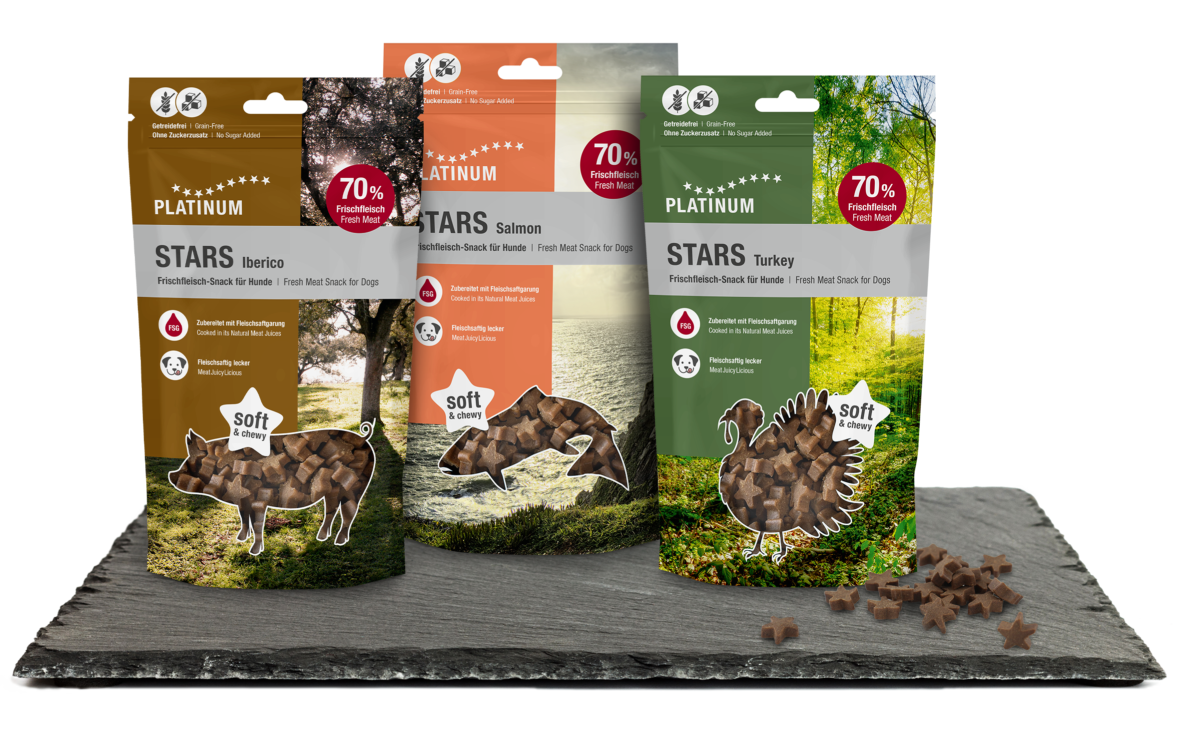 Le nostre STARS TRIO sono un assortimento di snack di carne fresca per cani.