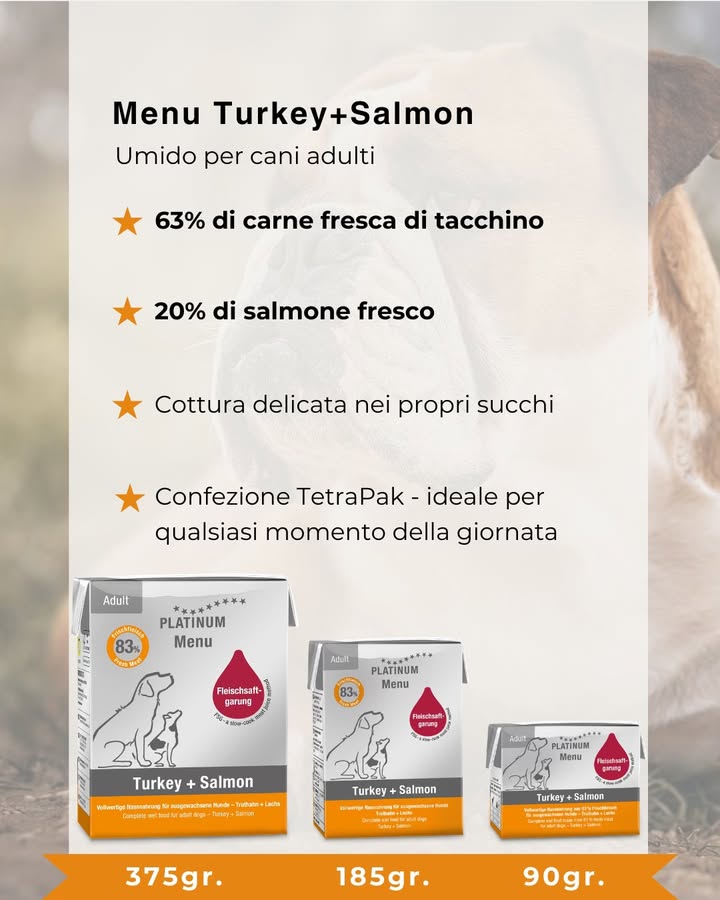Quando il delicato pesce incontra il tenero tacchino, il pasto nella ciotola del tuo cane diventa una vera delizia. ๐ Il nostro menu ๐๐ฎ๐ซ๐ค๐๐ฒ+๐๐๐ฅ๐ฆ๐จ๐ง fornisce al tuo cane tutto ciรฒ di cui ha bisogno quotidianamente: un pasto particolarmente gustoso e, grazie al nostro delicato processo di cottura con succo di carne, ricco di nutrienti.